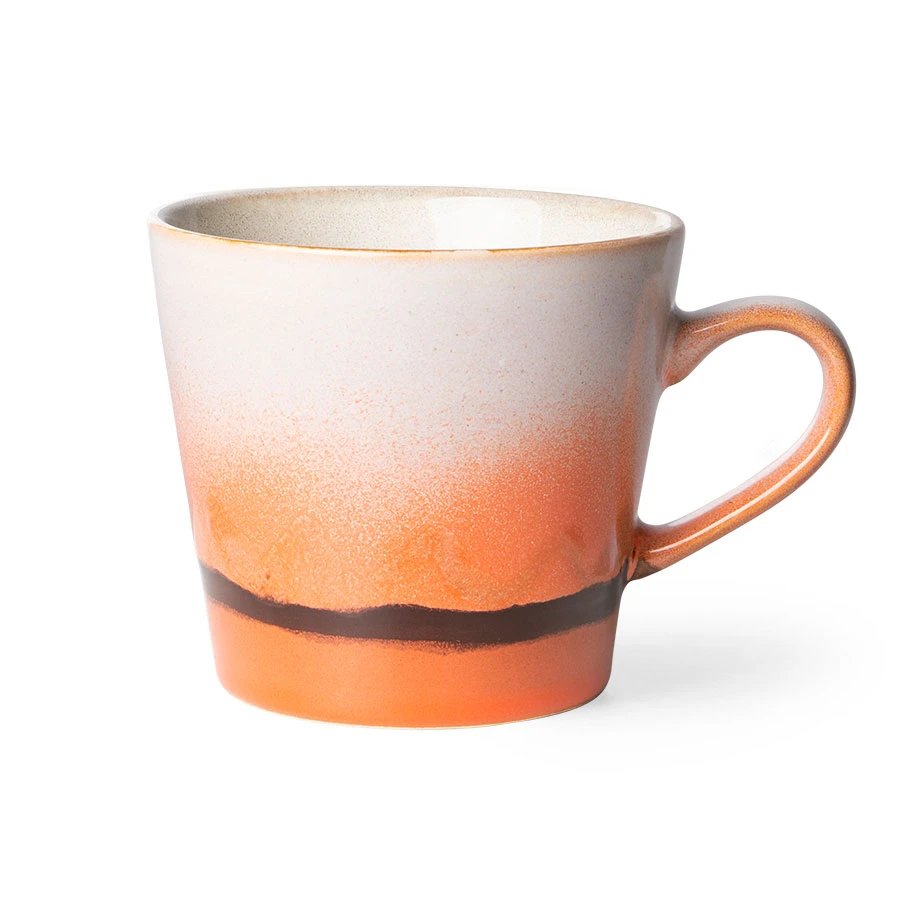 The Mars Cappuccino Mug from our popular 70s range features a striking ombre effect in a tonal array of deep oranges, reds and pinks with a contrasting hand painted brown line detailing. The glazing allows different textures and tones to show though, creating a really interesting and sophisticated effect. A unique combination that creates this beautiful Mug from the 70s inspired collection.