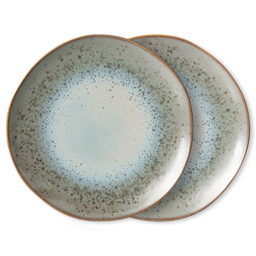 This set of 2 dinner plates are perfect for serving a home cooked dinner, luncheon or for layering up ceramics for a beautiful table display. The organically round plate features a textural grey blue background with a striking band that echos the round shape. A delicate splash of dark grey subtly mottles adds extra detailing. The reactive glaze makes it super tactile and soft to touch whilst making each piece completely individual.