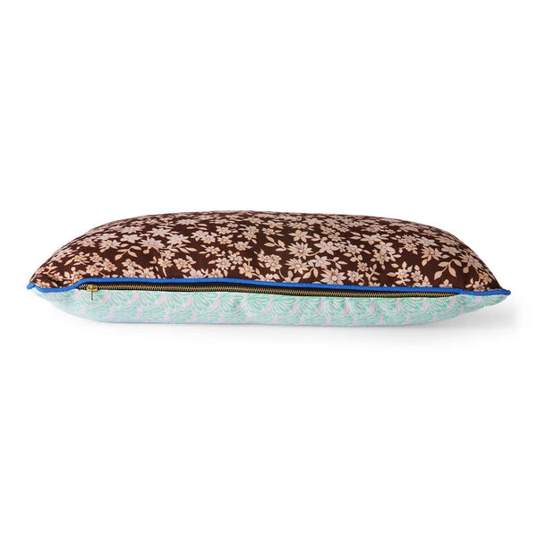 DORIS for HKLIVING Printed cushion; brown floral print on one side – green leave print on the other side. Cobalt blue piping and brass zipper closure. We are passionate about design, fashion, prints, vintage and craftsmanship and love to work with kindred spirits. It was love at first sight with DORIS vintage! That’s why a co-creation between two Dutch vintage loving brands was the only option. So may we present, with pride: DORIS for HKLIVING! We were inspired to give our iconic HKliving lobby bench a vintage touch up, so why not renew it with a DORIS inspired vintage floral print? Also our pillow collection could use some vintage vibe, so we created a mix of double sided printed cushions, inspired by DORIS’ vintage treasures. Kim Wijte is the vintage treasure hunter behind DORIS vintage. Her found treasures include: floral, boudoir, and ‘très chic’ patterns. Mainly found in clothing, but in our collaboration we decided to take it a step further. Together we created “something floral, something chic, with a boudoir finishing touch”; a collection that suits both our styles. Including cushion filling.