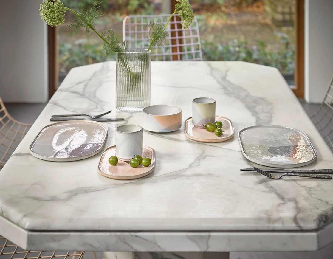 Curved furniture and powdery hues were the highlight of the Eighties. Inspired by those elements, we created a playful mix of organic shaped tableware in blush pinks with touches of blue hues and sunny yellow softness. Crank your cupboard up a notch with these colourful beauties.