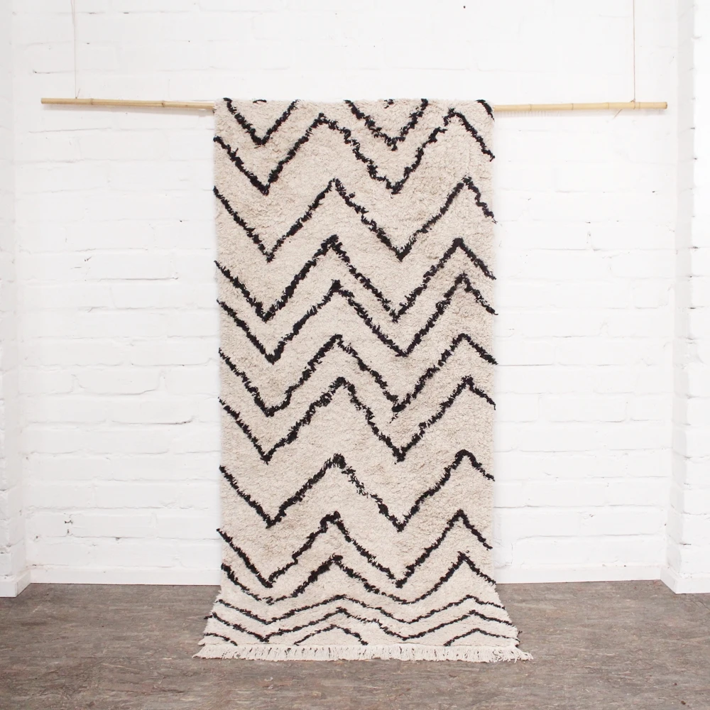 Long rectangular rug woven in cotton. Featuring a white base design with a black zigzag pattern. Its timeless and simple design makes this rug combine with all types of homes and decorations, whether in hallways, living rooms or bedrooms.