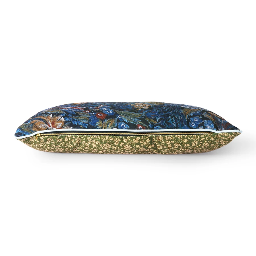 Printed cushion; night blue damast floral print on one side – moss green flower print on the other side. Ice blue piping and brass zipper closure.