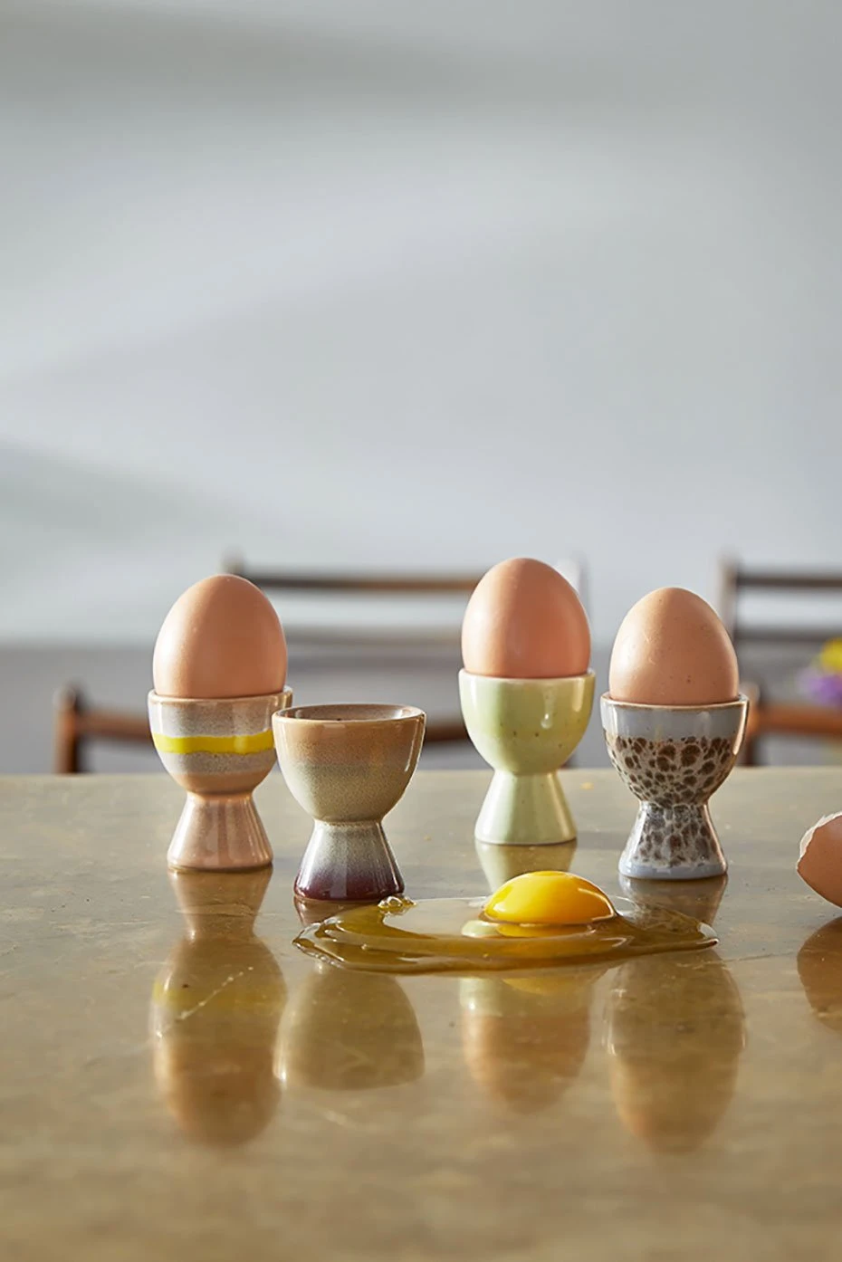A set of 4 handmade pastel coloured egg holders from HK Living’s 70s range. The Ceramic 70’s range from HK Living is a collection of retro-inspired designs channeling 70’s colour and form and repurposed for the modern kitchen.