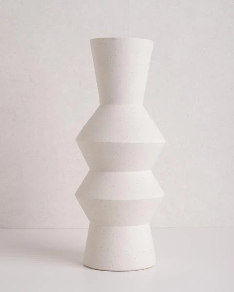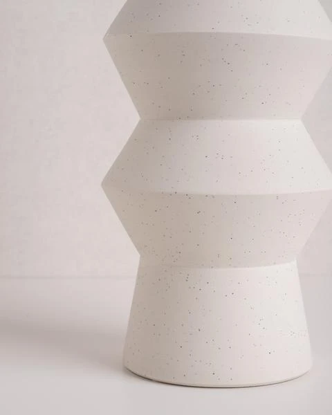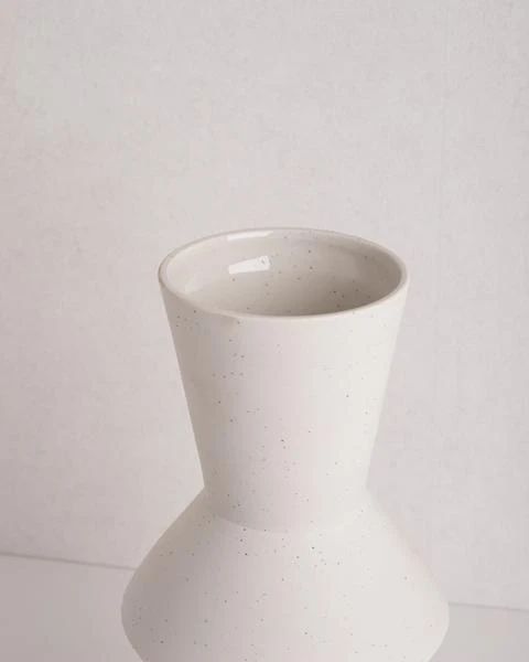 A handmade, white speckled clay vase.
