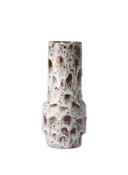 Spice up your home with this beautiful lava white retro ceramic flower vase from HK Living. colour: White/brown dimensions: 8,5×8,5×20,5cm product length/depth (cm): 8,5 product width (cm): 8,5 product height (cm): 20,5 product diameter (cm): 8,5 product weight (gr): 420 material: Earthenware characteristic: Reactive glaze water resistant: Yes Differences may appear: Yes