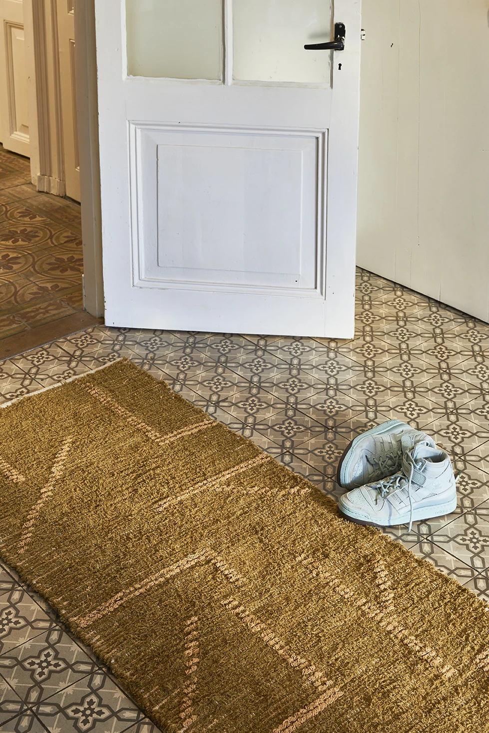 Give the warmest welcome into your home with this mustard coloured runner with abstract lines finished in a rich honey tone. This hand woven cotton runner is super soft and stylish. Made from sustainable, recycled cotton it makes the perfect finishing touch to make your house your home! When thinking about styling your home, start from the floor up. This fabulous runner is rich in colour and adds a statement to your living spaces whilst only adding to the comfort. It’s all in the details with this runner and we are proud to have it in our collection. Part of a collection of rugs and runners in similar tones.
