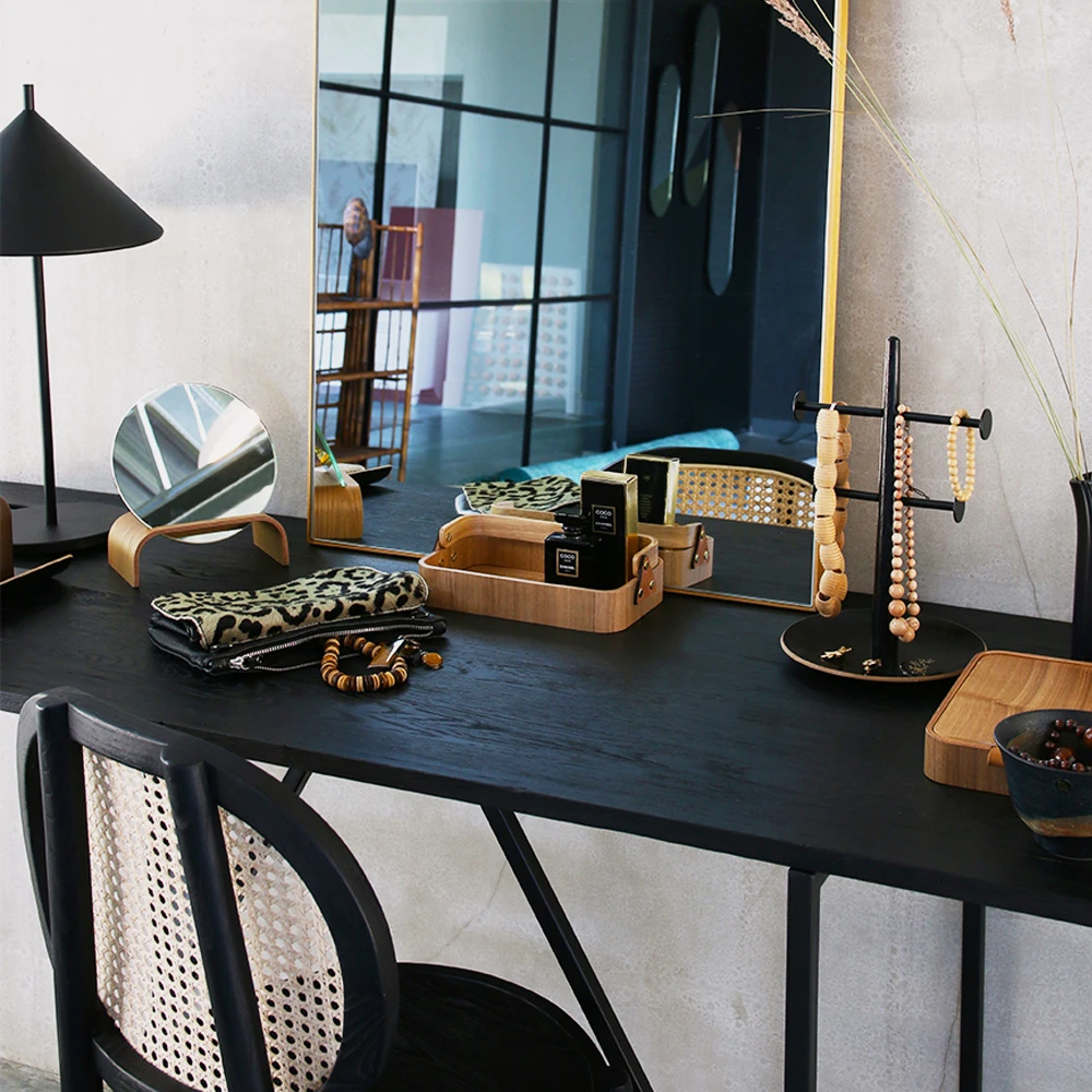 Willow wood box in a natural color with a central handle of the same material joined by original leather hinges topped with brass screws. A simple and discreet piece to store your jewellery, perfumes and accessories to have everything perfectly organized.